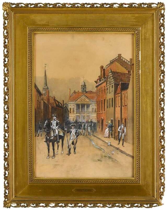 Inscribed in graphite on verso, "Colonel & Private 1st Regiment Continental Rhode Island Infrantry, W.S. Allen 1891," engraved title plaque on frame, watercolor on paper, framed.