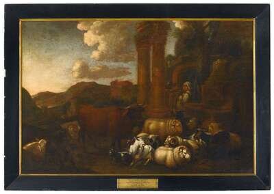 Continental School,17th/ 18th century romantic landscape with domestic animals