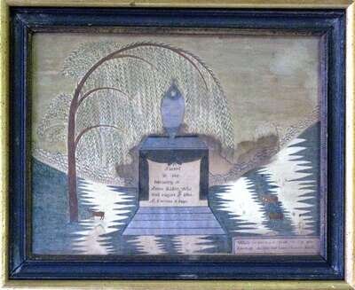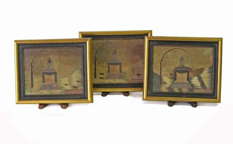 Unsigned, watercolor and ink on paper, framed,each worked with a weeping willow tree over monument. The first inscribed "Sacred to the memory of Anna Rider who died October 1st 1798, ae. one year one month,:" the second, "Sacred to the memory of Anna Rider who died March 10, 1800 ae.8 mo. 14 days," and the third, "Sacred to the memory of Anna Rider who died Aug. 8, 1806 Ae.8 wks 2 days."