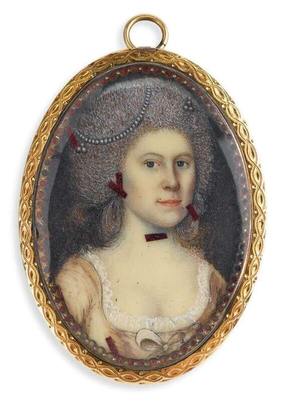 Watercolor on ivory, gilt bright cut pendant case bearing the initials "MP" on verso. (Bits of red tinsel loose under glass).