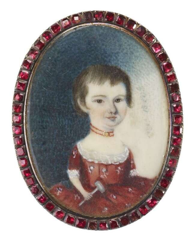Inscribed, "aged 15 mo," watercolor on ivory, gilt locket case inset with garnets.