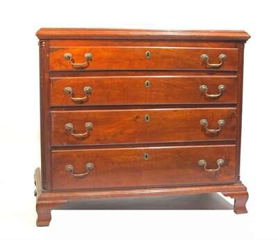 The rectangular molded top above four graduated lip-molded drawers flanked by fluted quarter columns, ogee bracket feet.