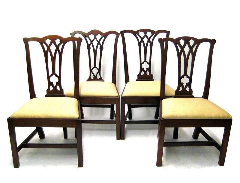 An assembled group, including a pair, each with a serpentine crest rail above a pierced "Gothic" splat, molded trapezoidal seat and squared legs joined by a stretcher.