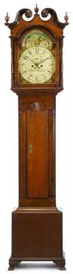 Double scroll cresting to bonnet with turned rosettes, above arched hood opening to painted brass moon phase face with off-white Arabic numeral chapter ring, inscribed "Samuel Breneiser," curved day/date window, flanked by baluster turned columnettes, lip molded waist door with "shell" carved top, fluted quarter columns, plain plinth, ogee bracket feet.
