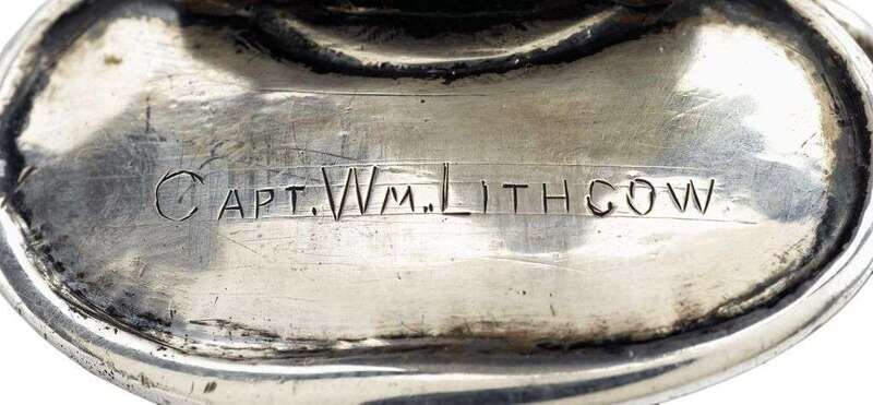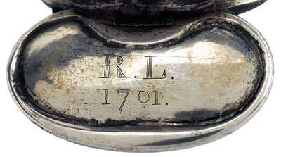 Tyler's mark stamped twice, on quillon and knucklebow, the undersides of shells engraved with the initials, "RL" for Robert Lithgow and the date "1701" and "Capt. Wm. Lithgow," the blade etched with full figure of an Indian and scrollwork. .
