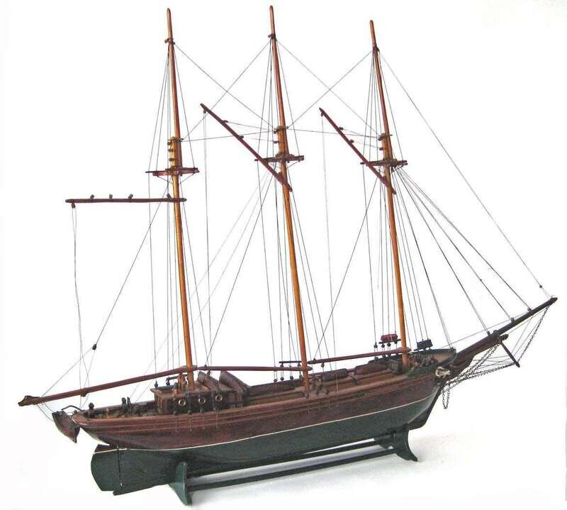 Painted wooden model of a three masted ship, GaspeTrader inscribed, "e. leclerc" 20th century