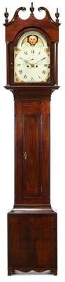 Double scroll cresting to bonnet with turned rosettes, urn form finials above a painted brass moon phase face with black on off-white Arabic numeral chapter chapter ring, inscribed "Samuel Breneiser," curved day/date window, the waist with band-inlaid door, reeded chamfered corners, band-inlaid plinth, shaped bracket feet.