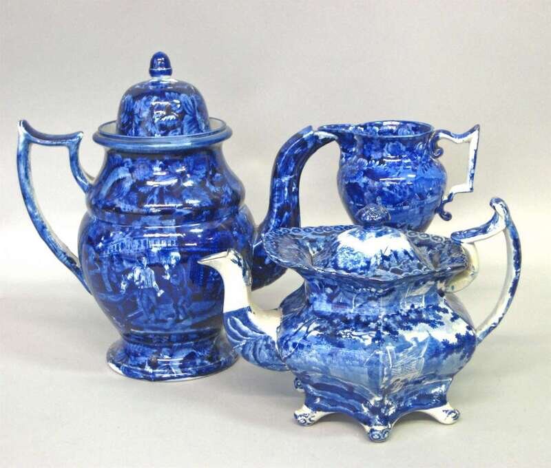 Including an Historical blue creamer decorated with "Entrance of the Erie Canal into the Hudson at Albany," and "Aqueduct Bridge at Little Falls," a domed-lid coffee pot, and an octagonal teapot decorated with a rural scene.