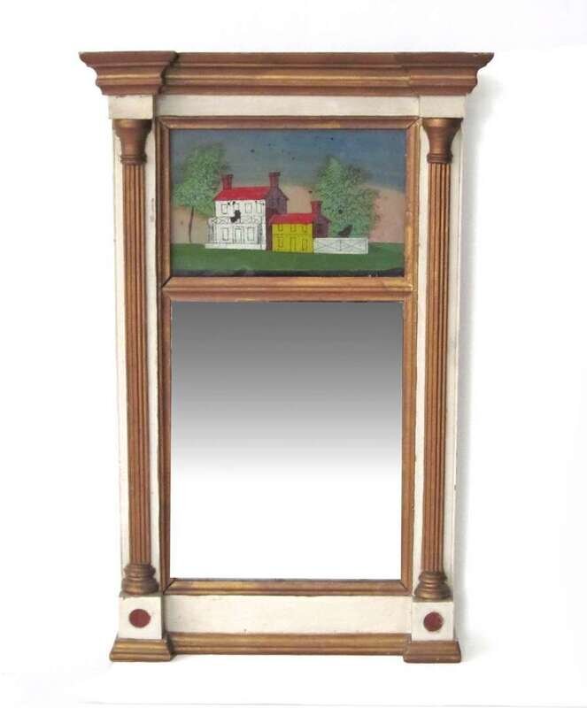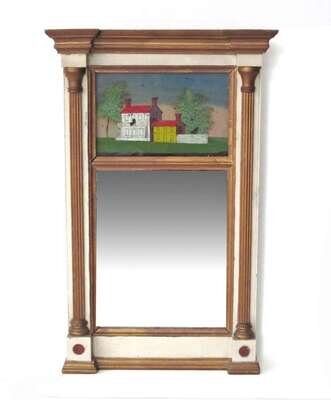 Having a stepped and molded cornice, reeded pilasters enclosing an eglomise panel of a home, mirror plate below.