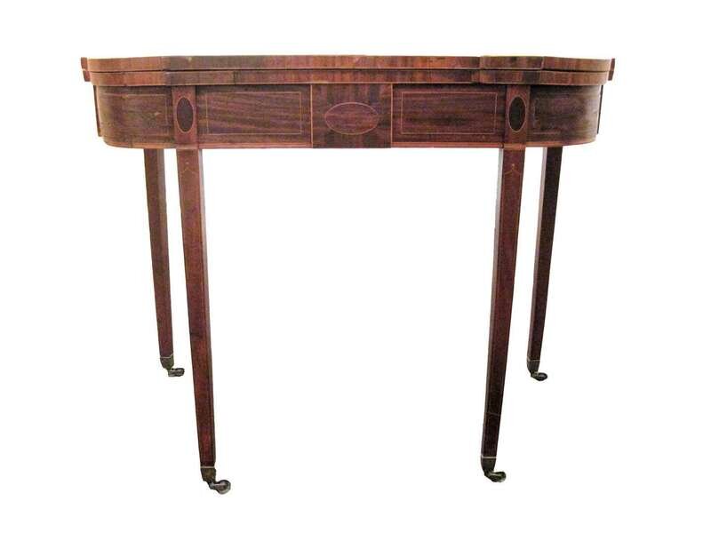Rectangular top with ovolo corners, conforming apron with oval inlay at top of legs, square tapering inlaid legs on casters.