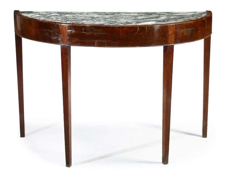 The demilune frame fitted with conforming marble top on squared tapering legs.