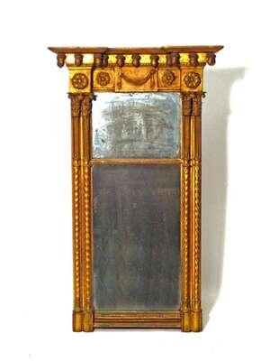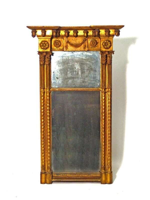 With stepped and molded cornice hung with spherules above mirror plates, flanked by double column framed, molded base.