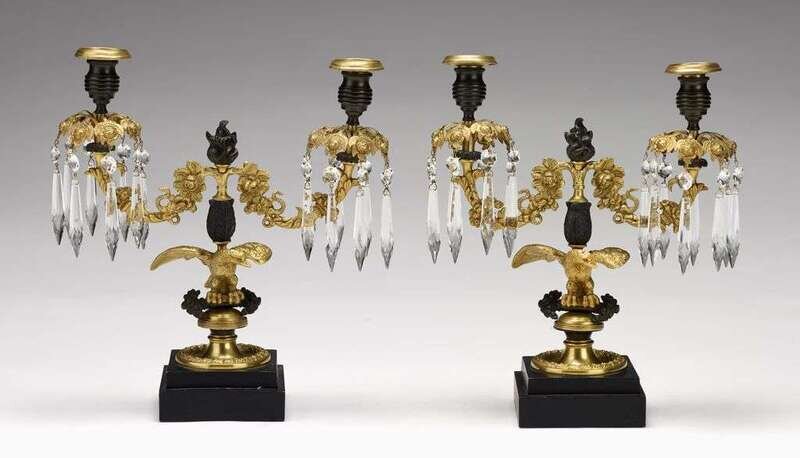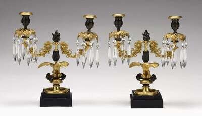 Each with two scrolled candlearms with patinated candle cups and hung with lustres, on shaped support with gilt spread wing eagles on squared plinth.