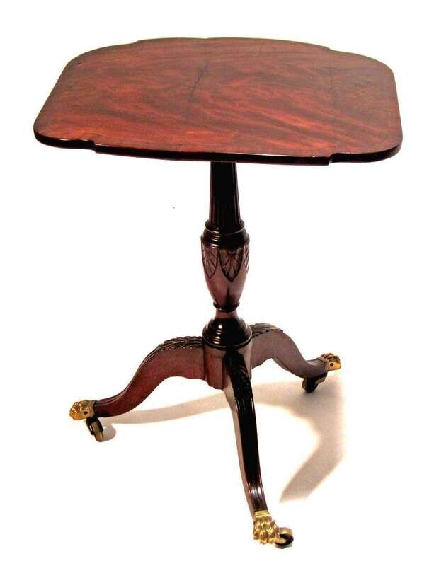 The shaped and veneered and band inlaid top tilts on reeded and leaf-carved urn form support downswept leaf-carved and molded legs ending in brass paw feet, on casters.