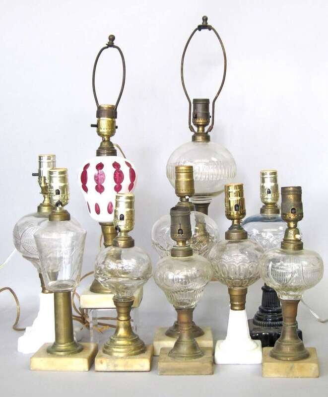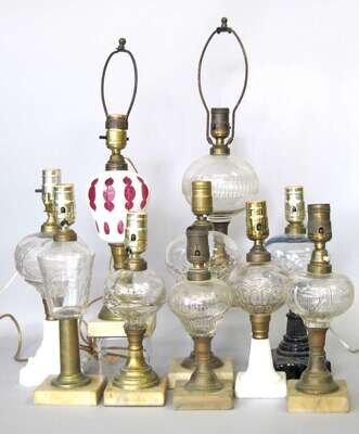 Group of ten assorted glass, brass and marble table lamps 19th century