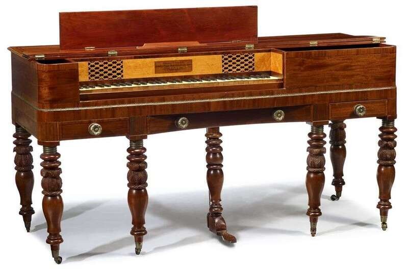 Classical carved mahogany pianoforte label of george blake cabinet & spinet pianoforte manufacturer, philadelphia