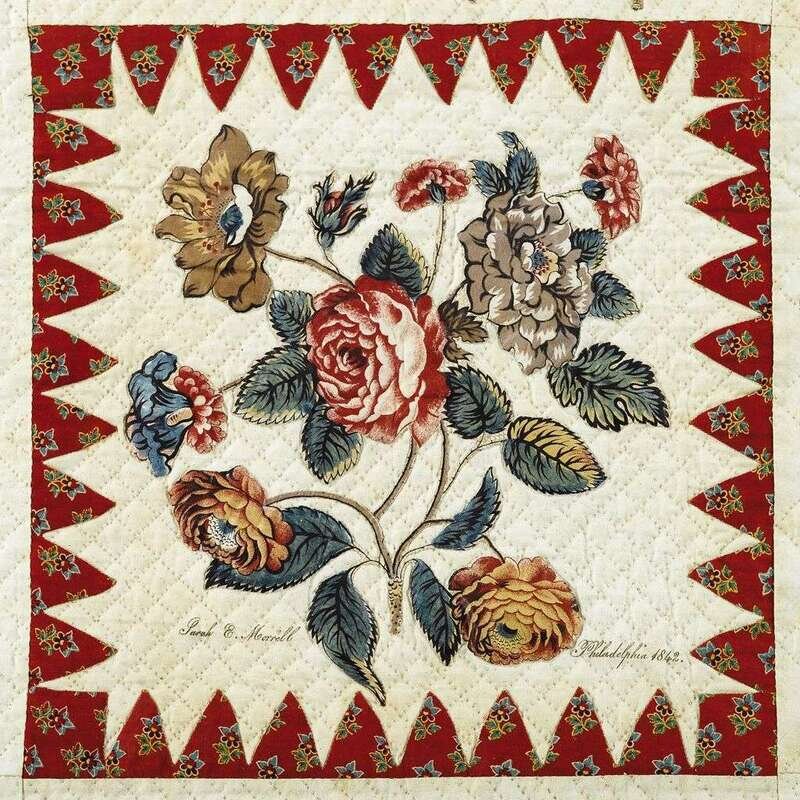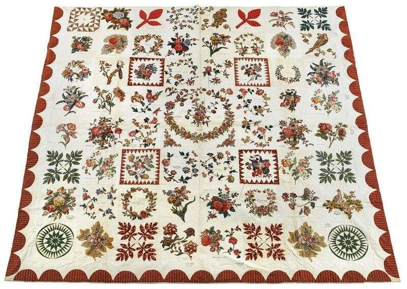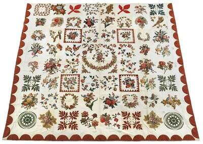 Comprised of cut-out flowers, birds, and floral sprays of roller-printed imported furnishing fabric and pieced squares of leaves and compasses in printed cottons, within three sided scalloped printed cotton border, the squares bearing signatures of men and women from the Shinn, Emley, Oliphant, Brick, Borden, Waln, Biddle , Morrell, Allen, Jobes, and Newbold families, from Pleasant Hill, Camden, Manahawken, New Egypt, New Jersey, Philadelphia, and New York.