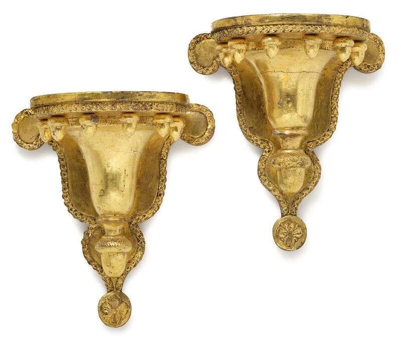 Each with a floral molded edge back plate and and a urn form center with large acorn drop surmounted by a a demilune shelf having acorn decoration.