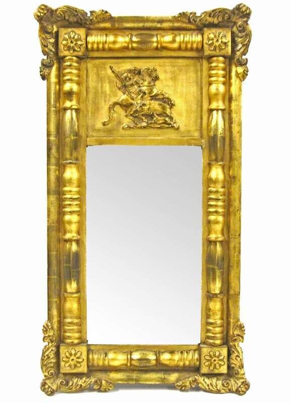 Corner leafy scrolls and quarter round frame encloses split baluster inner frame with molded and raised panel showing a horse and rider.