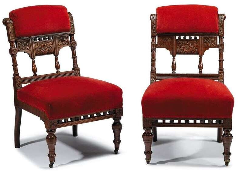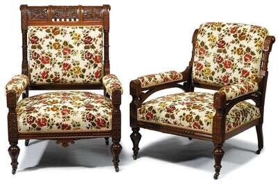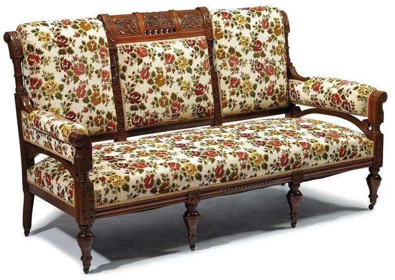Suite of "Modern Gothic" walnut upholstered chairs and sofa school of daniel pabst, philadelphia, circa 1875