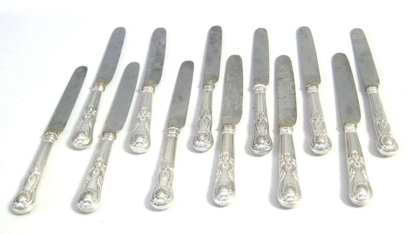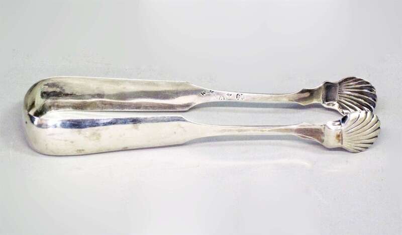 With an oval reeded bowl, together with a silver fiddle handled sugar tongs with shell grips with mark of William Miller, Philadelphia, circa 1810 and twelve English silver dinner knives, "Kings" pattern with steel blades.