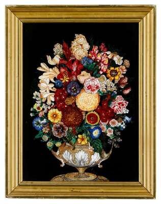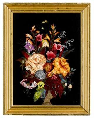 Including a pair, with black ground and arrangement of flowers in urn, the third, with white background and arrangement of flowers in urn, and the fourth, with black background with floral spray, blue ivy border and the name "May," all framed.