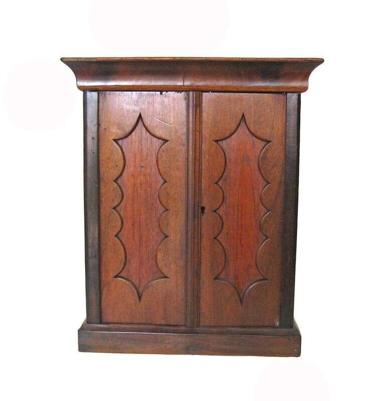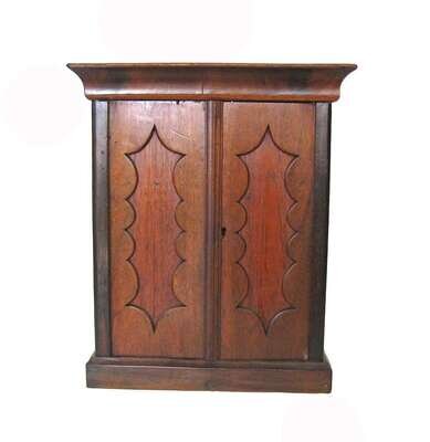 Cove molded cornice above two doors with recessed scalloped panels opening to shelves on molded base.