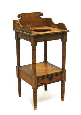 Original ochre paint with black pinstriping, the shaped back board and sloping sides above turned legs and media shelf with drawer below, tapering feet.