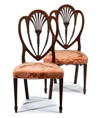 Each with carved heart shaped backs on overupholstered seats, tapering square turned legs, spade feet.