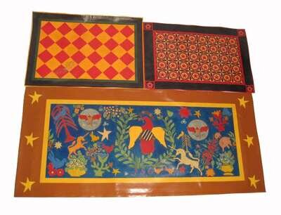 The first a runner painted with eagles, unicorns, flowers, stars and pigs, with the initials,"JSC," the second with overall diamond pattern, the third with flowerheads within circles and grid.