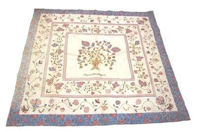 Worked with crewell embroidery and appliqued chinz patches, a vase of flowers enclosed by flowering vine borders.