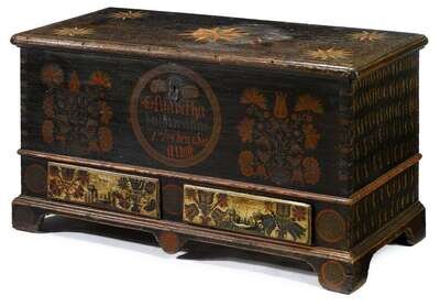 Painted and decorated dower chest possibly northhampton county, pa dated "1798"