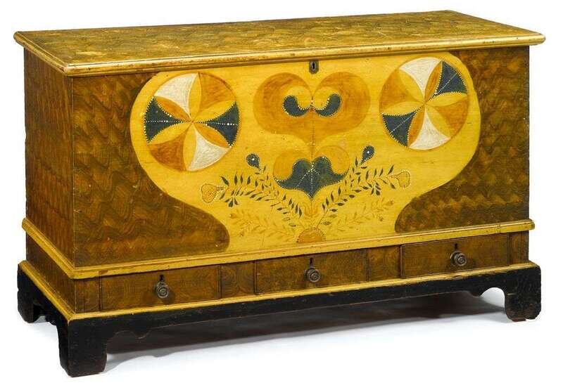 Grain painted and decorated dower chest with drawers centre county, pa, circa 1820