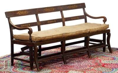 The scrolled arms enclose straight crest rail and back rest on rectangular frame seat, raised on saber legs, the seat is hinged, folds out to form bed, rose wood grain painted and decorative with gilt stenciled Neo Classical devices.