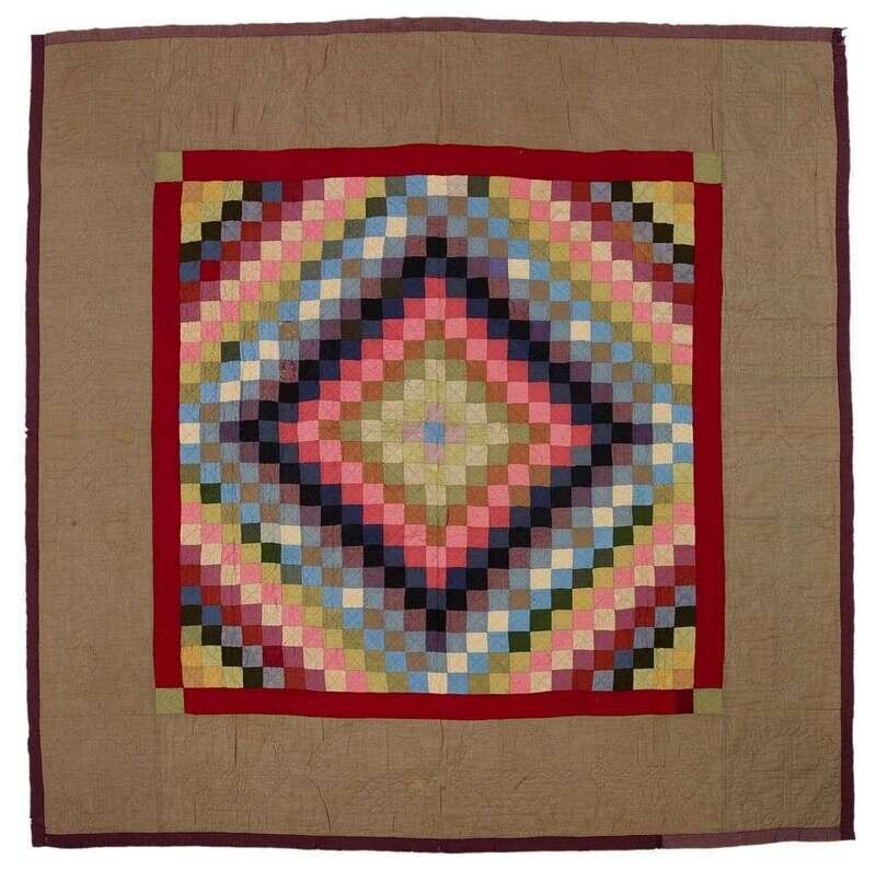 Initialed "L.S., variously colored patches worked in a "Sunshine and Shadow" pattern, overall diamond, the border with basket of flowers quilting.