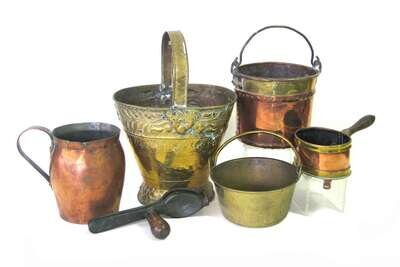 Including a small cast brass bucket, a bronze spoon mold, a copper and brass coal bucket with the inscription "H. W. 1778," a wood handled copper and brass pipkin, a repousse copper basket, and a copper handled pitcher.
