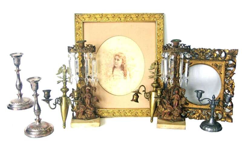Including a pair of brass wall sconces with eagle finials having a vasiform back plate with two candlearms, together with a pair of gilt metal girandoles cast in the form of two gentleman and dog on marble plinth, a square pierced and carved gilt frame, one twin light pewter candlestand, a pair of silverplate candlesticks, and a color-enhanced photo of a young girl in an oval mat and a gilt frame with leaf decoration.