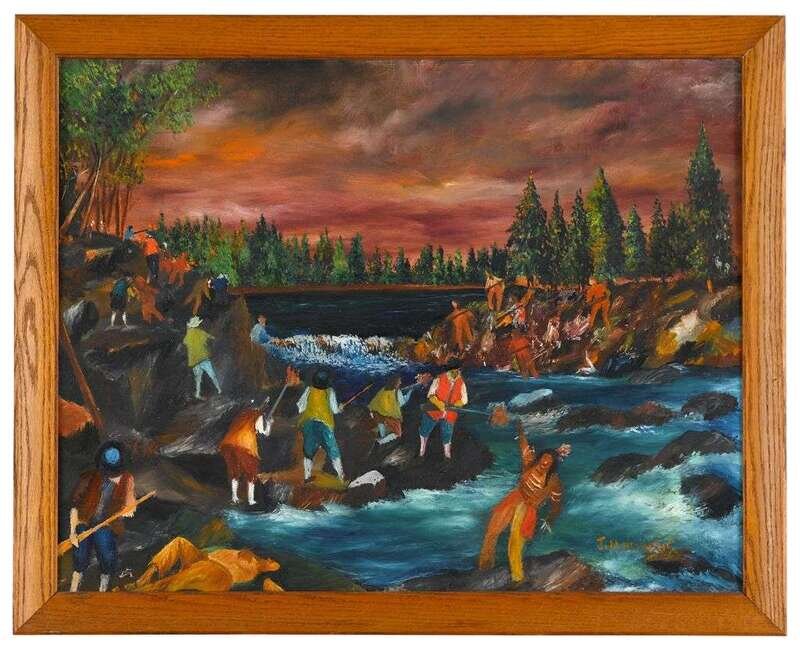 Signed and dated "John Hoenig Morris 6/20/60", depicting 1676 battle between colonists and Indians. Signed in verso, " Captain Turner Battle-Turners Falls, Mass ," oil on canvas mounted on board, framed.