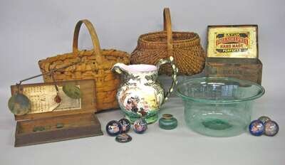 Including two splint baskets, a blown glass pale green bowl, a blown glass ink bottle, a molded Staffordshire pitcher, a boxed gold scale with the printed paper label of Samuel Grey , Philadelphia and eight glass horse bridle ornaments with eagle and American Flag converted to cloak pins.