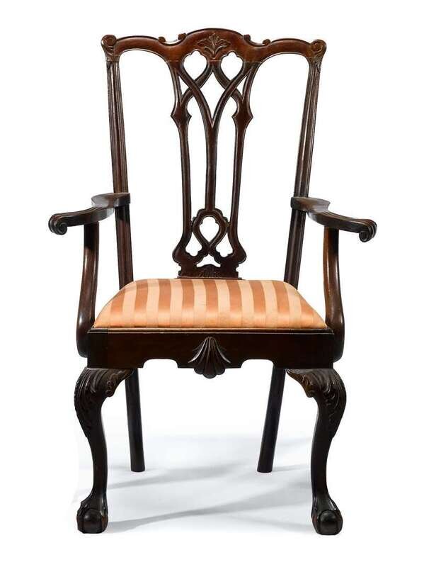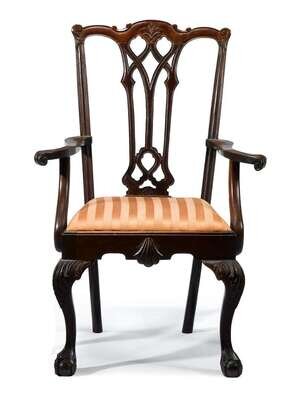 The molded serpentine crestrail above pierced splat, trapezoidal seat and cabriole legs ending in ball and claw feet.