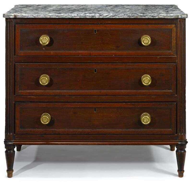 Each with outset corners above fluted corner column enclosing three molded drawers, double paneled sides, molded base and tapering conical feet, one with King of Prussia marble top, the other with conforming mahogany (replaced) top.