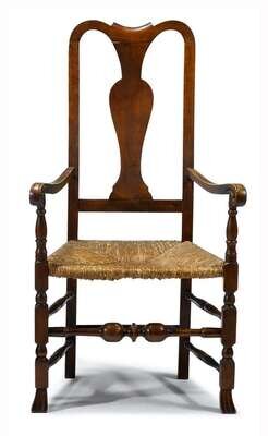 Yoked cresting above solid urn form splat, slightly scrolling arms, rush seat, vase, block and ball turned legs ending in Spanish feet, joined by bulbous turned front stretcher.