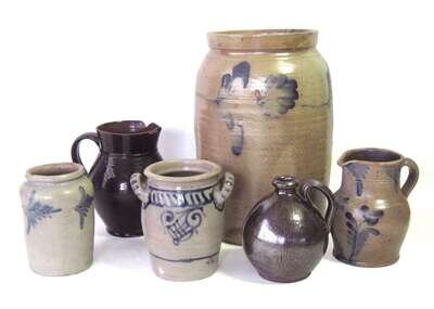 Including a stoneware pitcher decorated with flowers and leafage, a three gallon churn, a small jar, and a two-handled jar, together with a brown-glazed redware pitcher and a small brown glazed redware jug.