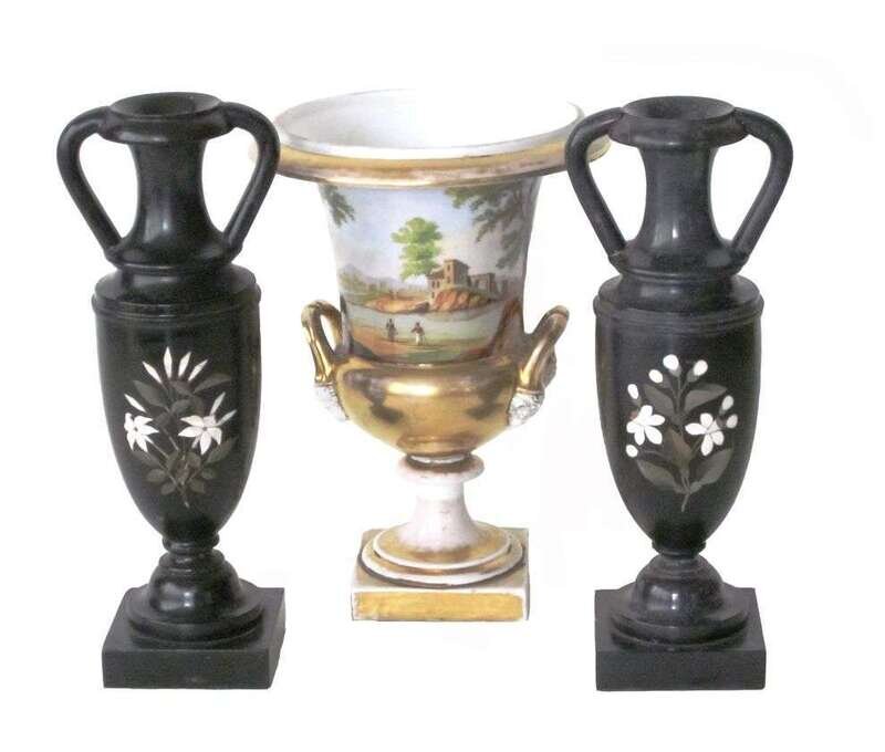 Each of amphora form inlaid with green and white stone, together with a Paris Porcelain urn decorated with landscapes.