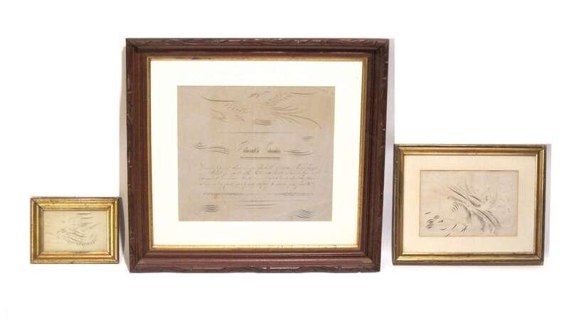 Including a bird in flight with a banner inscribed, "Lucia H. Shaw" dated "1879", the second with a bird and bannerette, entitled "Quill Driver" dated "April 5, 1873, " and the third, with an American eagle over a poem entitled, "Education, Education.," in blue and brown ink, all framed.