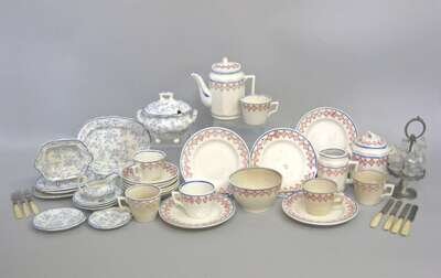 Including a partial service of blue transfer-printed Staffordshire with covered tureen and stand, three platters, open vegetable serving dish, gravy boat and stand, three soup plates and a small plate; three bone handled knives and forks; a pressed glass and pewter cruet stand; and a tea service decorated with red stamp and blue striping including a teapot, covered sugar, creamer and waste bowl, six saucers, six plates and six cups.