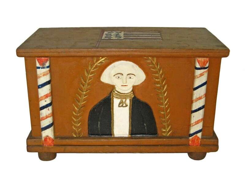 The rectangular lift lid carved with American flag above case carved with George Washington and flanked by two red, white and blue painted pilasters, cylindrical feet.