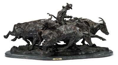 Hollow recast bronze sculpture of a cowboy surrounded by steer on faux marble base, engraved "Frederic Remington."
