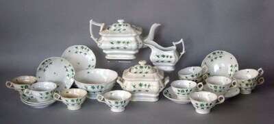 Having green floral and vine decoration ,comprising eleven saucers, eleven teacups, tea pot, sugar bowl, creamer, and waste bowl.