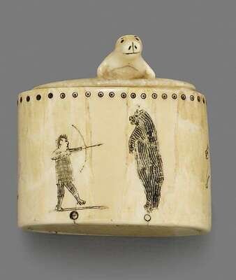 Of oval form, the lid with seal form knop, on box decorated with bow hunter and bear, walrus, and.